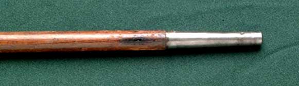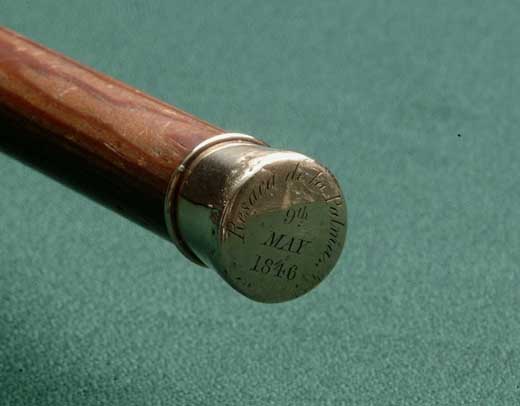 35¼" cane from the staff of a Mexican standard captured by Lt. Colonel William Goldsmith Belknap 9 May 1846 at Resaca de la Palma, Texas during the Mexican War. Colonel Belknap rallied his troops to break the Mexican line and later had the "split mexican stick" sent to New York to have it mounted in gold. Belknap was brevetted Colonel for his actions and later Brigadier General at Monterey. For the full story of this historic personal battle honor see "Gen. Belknap's 'Old Split Mexican Stick" in the Articles Section.