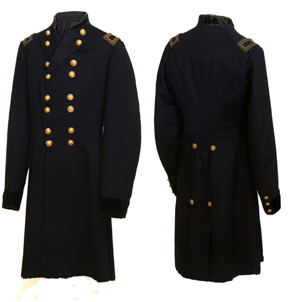 The sleeves are adorned with an intricately woven captain's trefoil of gold piping. A detailed trefoil also ornaments the back of the jacket at the waist. Matching gold piping trims the collar and edges of the coat. The fabric of the garment is finely woven broadcloth, slightly lighter blue than the typical officer's frock coats of the period. Both sleeves are widely tapered at the elbow, narrowing at the cuff, and nicely gathered at the shoulder seams. The inside lining is green polished cotton; the sleeves are lined with white cotton. An interior pocket is sewn into the left breast. All sixteen matching eagle "I" buttons bear "Scovill Mfg. Co." backmarks. The captain's shoulder straps are on a dark blue field, with dead bullion gold borders, interspersed with bright bullion strands.